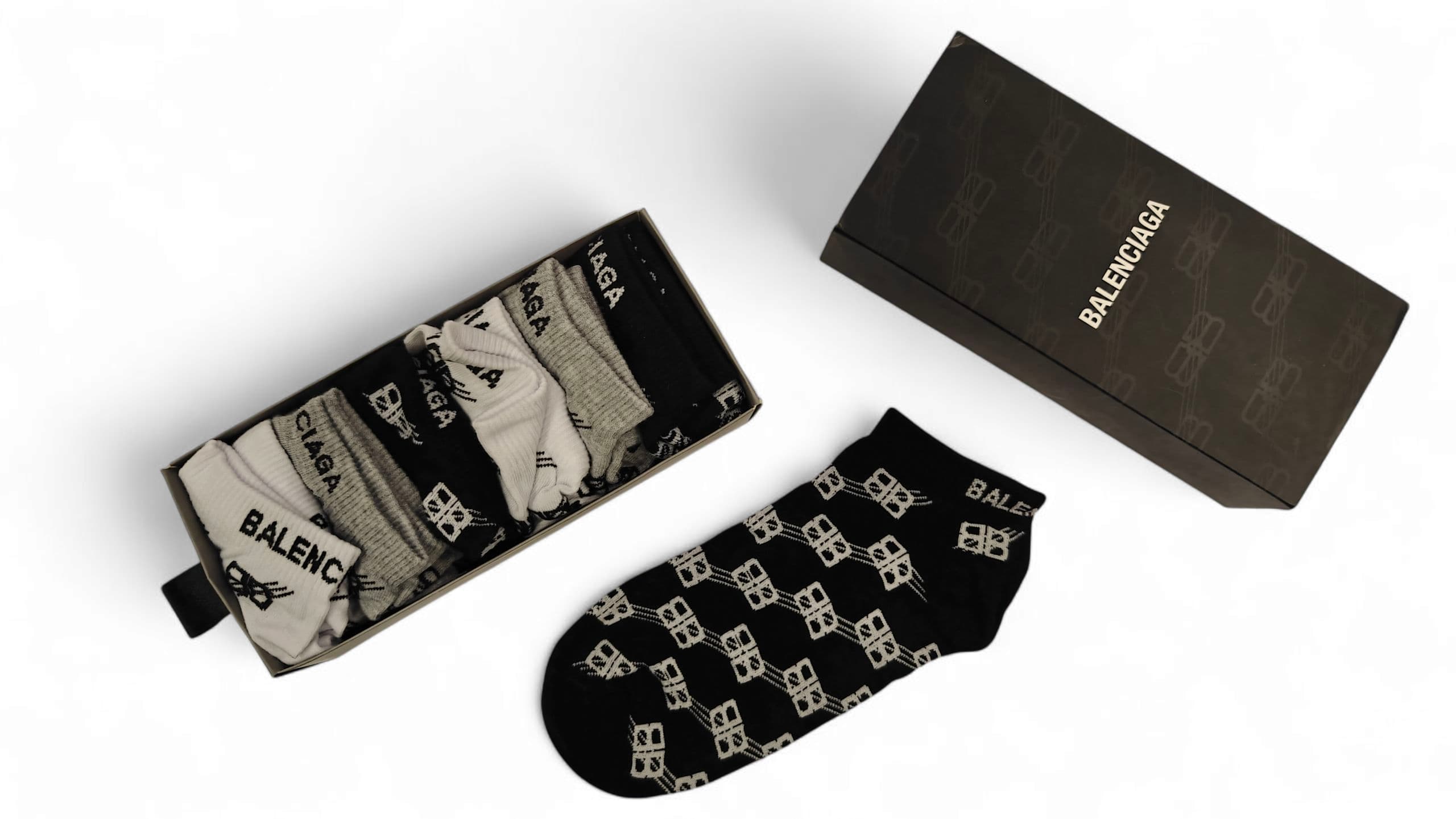 This pack of six Balenciaga ankle socks, expertly made in Turkey, offers a blend of luxury and practicality. Featuring a comfortable, precise fit and durable construction, each pair is infused with a subtle fragrance to maintain freshness throughout the day. Ideal for those who demand both style and performance in their everyday wear.